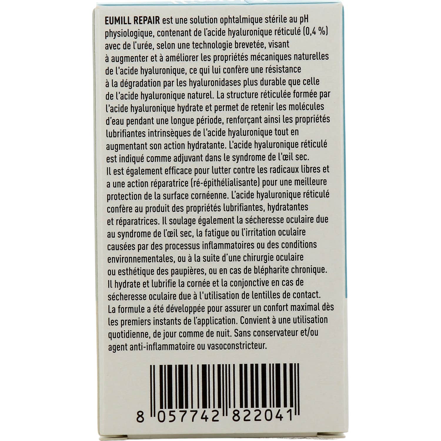 Eumill Repair a un pH physiologique et sa composition inclut de l'acide hyaluronique réticulé avec de l'urée. Cet ingrédient améliore les propriétés mécaniques de l'acide hyaluronique, se distinguant par sa capacité lubrifiante et son action hydratante.