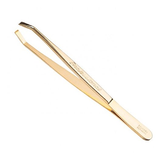 Pince à épiler pour l'épilation des sourcils, à usage personnel et de qualité professionnelle, de couleur or. Fabriqué avec une pointe large et une coupe droite, qui permet une bonne prise sur le poil grâce à sa forme en "crabe", étant idéal pour arracher les poils les plus courts et les poils incarnés grâce à la prise ferme qu'ils offrent.