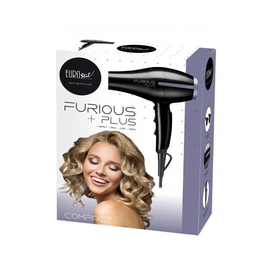 Le sèche-cheveux Furious Plus d'Eurostil a une puissance de 2200W et une technologie ionique, céramique et tourmaline qui permet un séchage plus rapide et une finition des cheveux plus lisse et plus brillante.