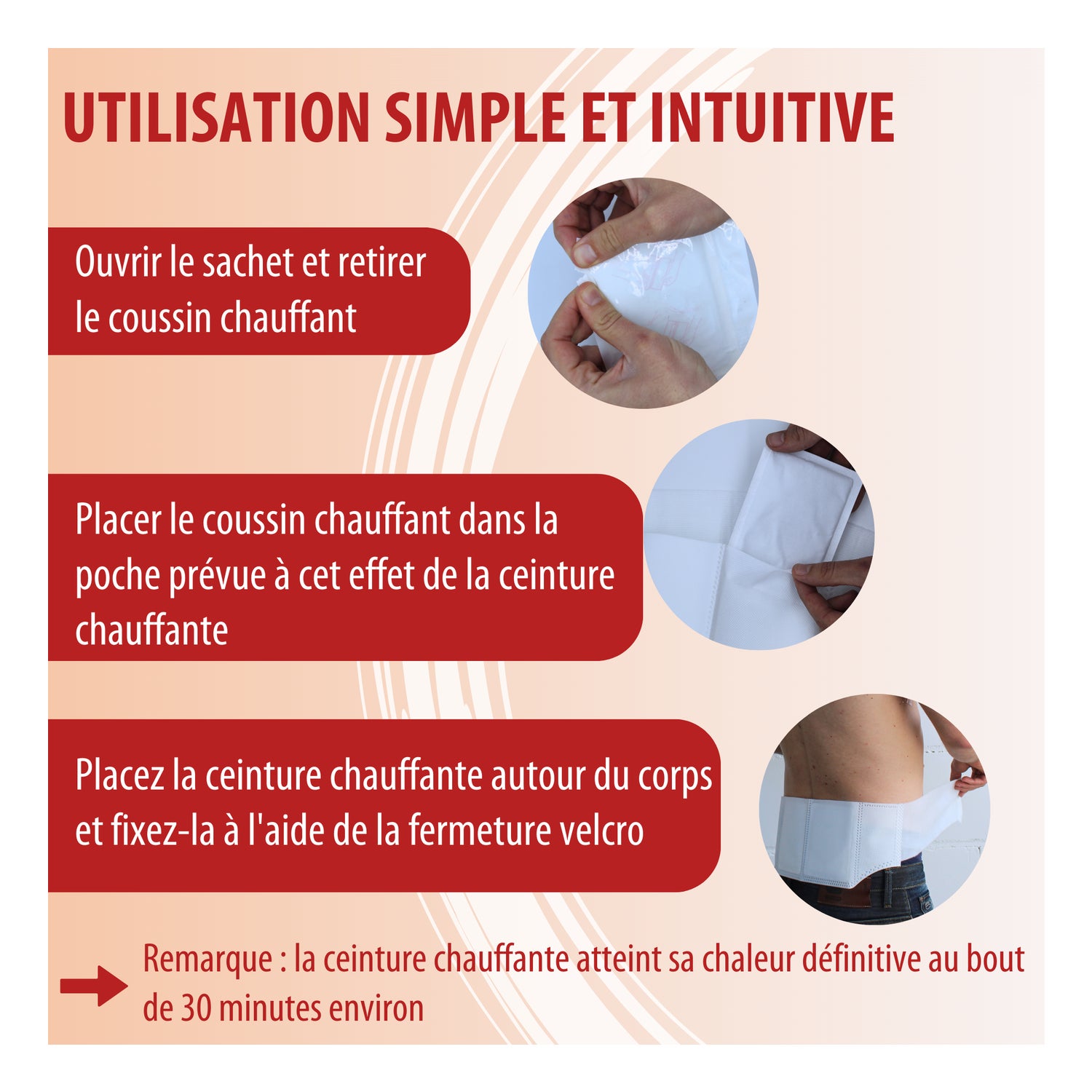 Les coussins chauffants atteignent leur chaleur bienfaisante, douce et homogène en 30 minutes environ, et peuvent durer jusqu'à 12 heures. Fabriquée dans un matériau doux et agréable pour la peau, cette ceinture chauffante épouse parfaitement la forme du corps.