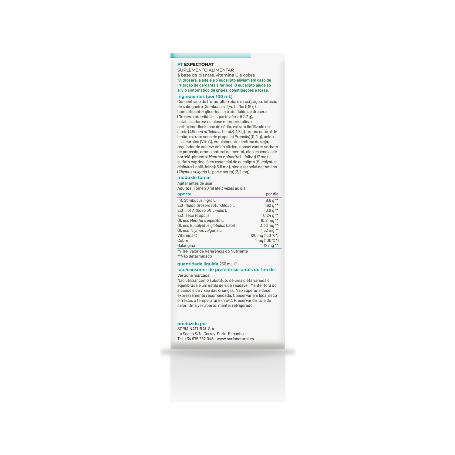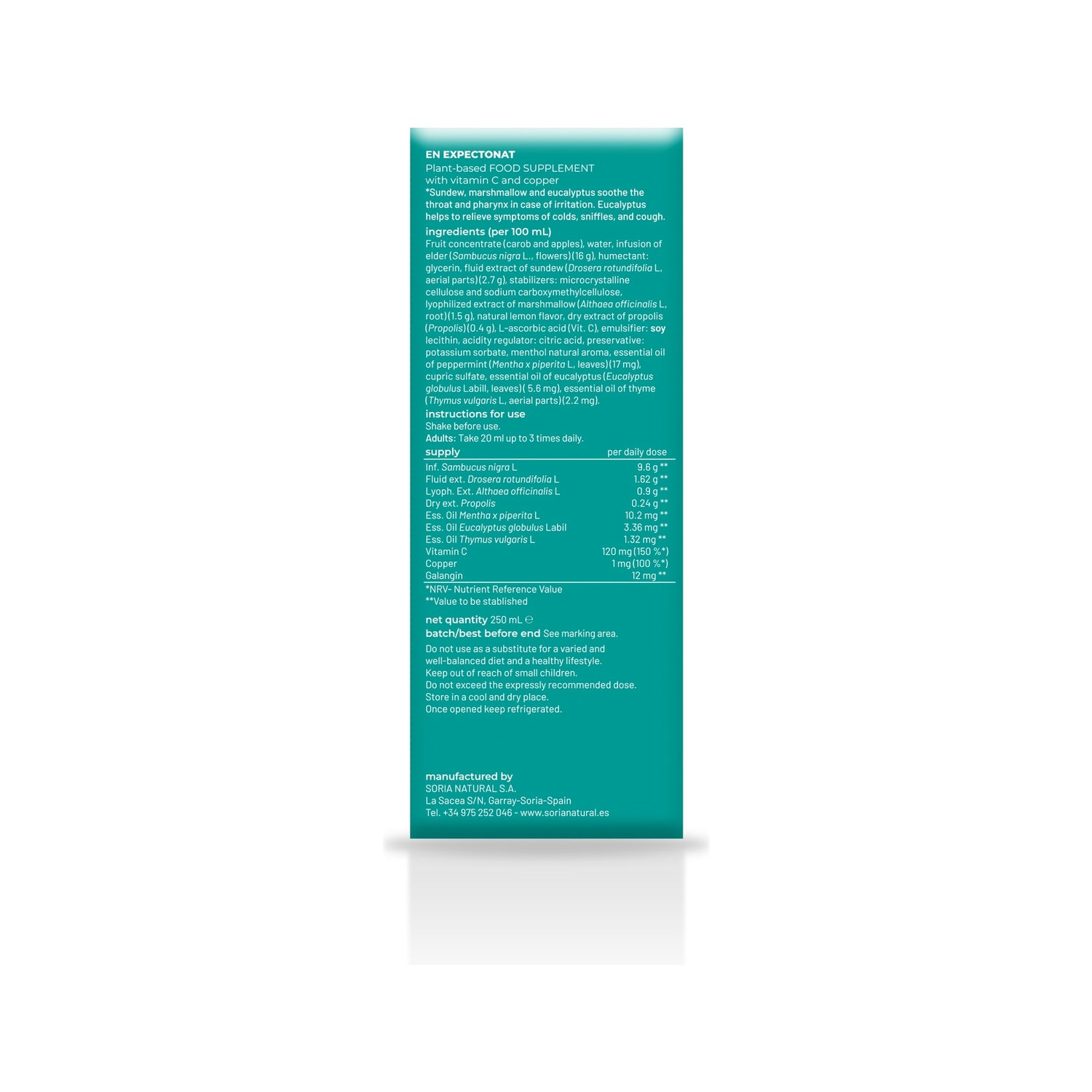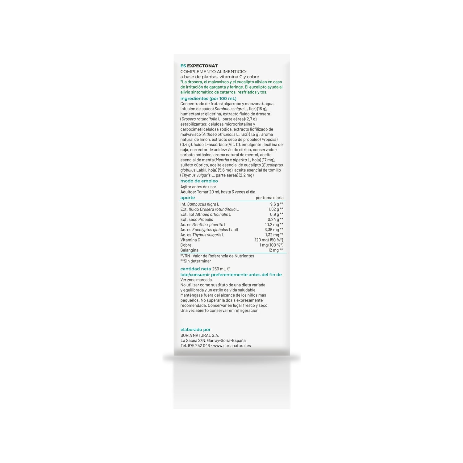 Complément alimentaire avec sureau, guimauve, droséra, eucalyptus, thym et menthe indiqué pour améliorer l'appareil respiratoire et pour le soin de la gorge et des voies respiratoires, aidant à :