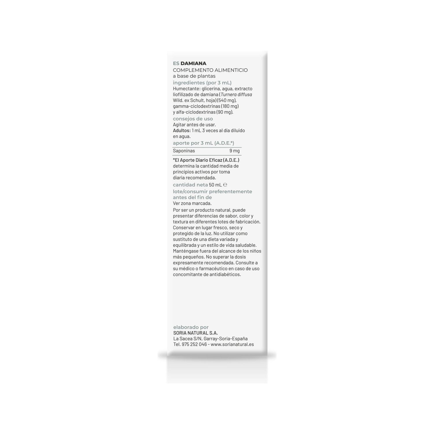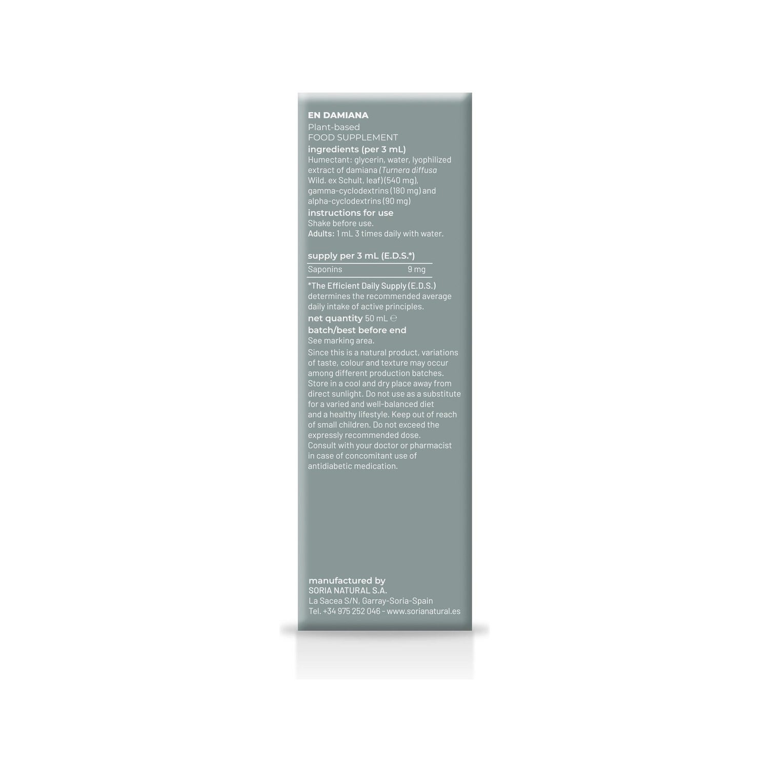 Ingrédients pour 3 ml : 540 mg d'extrait lyophilisé de damiana (turnera diffusa sauvage). 180 mg de gamma-cyclodextrines. 90 mg d'alpha-cyclodextrines. Glycérine végétale et eau distillée.