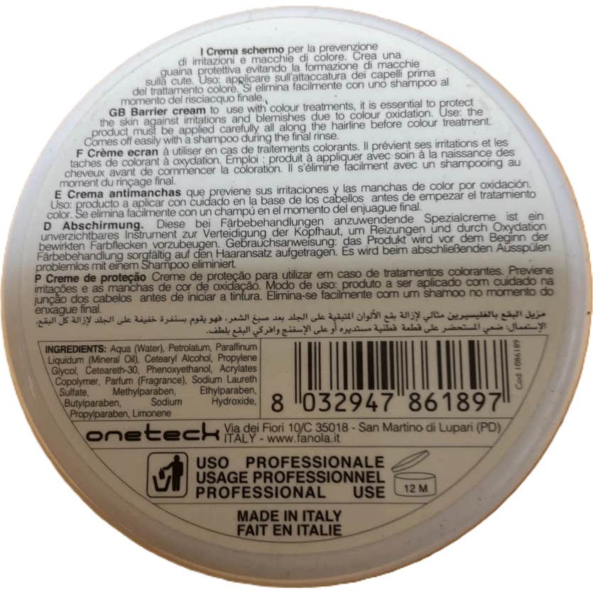 Crème Barrière Fanola Utilities 150 ml pour les traitements de couleur est une crème barrière de FANOLA qui aide à protéger la peau du cuir chevelu et le contour du visage contre les irritations et les taches associées à l'utilisation de teintures et de produits chimiques agressifs. Elle est indiquée tant pour les coiffeurs professionnels que pour un usage à domicile.