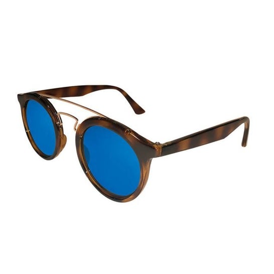 Farline Lunettes de Soleil Fiyi Écaille 1ud sont des lunettes de soleil polarisées avec une monture en acétate écaille et un pont doré métallique. Elles disposent de verres ronds et de verres de couleur bleue.