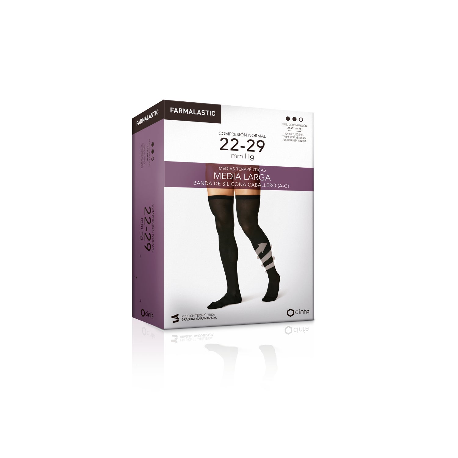 Farmalastic Homme Moyen Long (A-F) Compression Normale TL Noir est indiqué pour lespersonnes qui souffrent de problèmes circulatoires, d'enflure ou de varices. Ils sont également utiles pour les personnes qui passent de longues périodes sur leurs pieds et leur pouvoir de compression contribue à améliorer la circulation sanguine.Il est fixé par une bande en silicone sans dentelle et possède un tissu dense (140 den) à forte teneur en coton.Lemodèle TL a un tour de mollet approximatif de 37-39 cm et un tour de cheville de 24-25 cm.