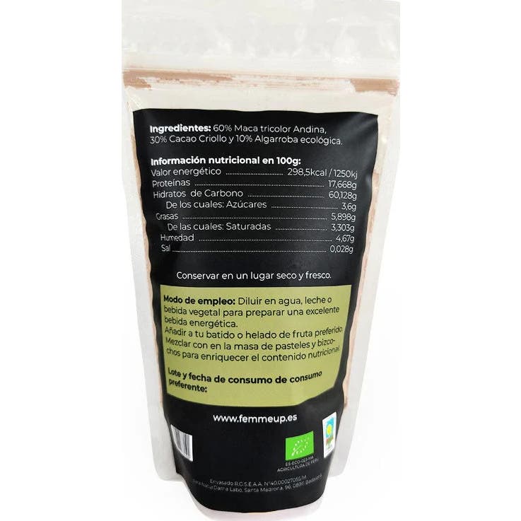 Pure farine de maca des Andes, issue d'une production biologique certifiée, composée de trois types de racines (50% de maca jaune, 30% de maca rouge et 20% de maca noire), de cacao criollo, de caroube et de panela, idéale pour la préparation de shakes ou la cuisson. Il aide à augmenter les performances physiques et intellectuelles, à réduire le stress, à avoir un pouvoir réparateur général et antioxydant, ainsi qu'à équilibrer le système endocrinien, favorisant la fertilité.