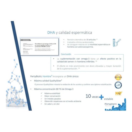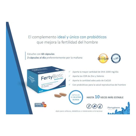 Complément alimentaire pour homme qui allie la puissance antioxydante à l'effet bénéfique des probiotiques pour aider à améliorer la fertilité. Contient du DHA de haute qualité et en fortes concentrations qui renforcent l'effet antioxydant.