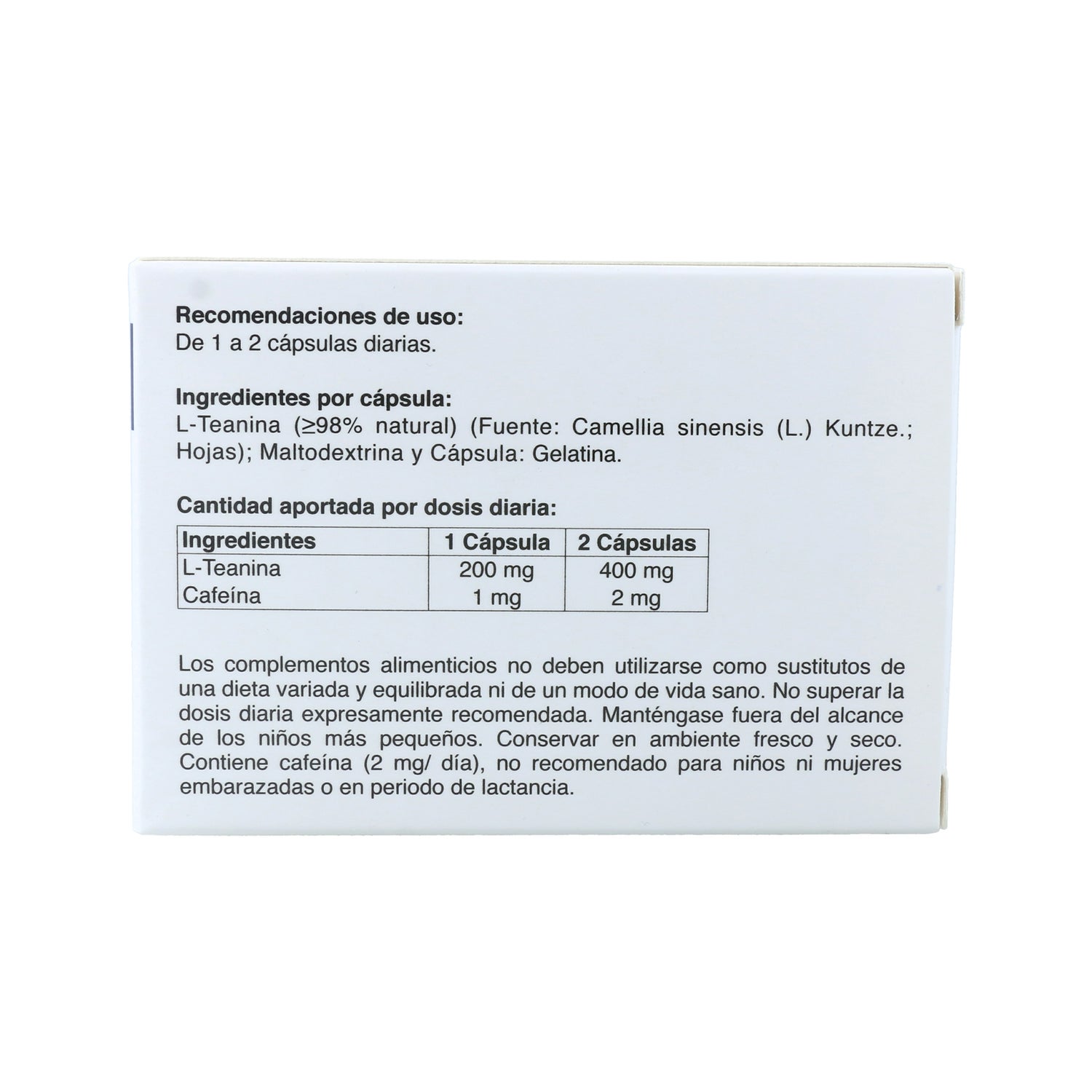 Complément alimentaire sous forme de gélules, qui procure un état de relaxation, sans provoquer de somnolence, qui aide à réduire le stress léger. Fabriqué à partir de L-Théanine, un acide aminé présent dans le thé vert et connu pour ses effets relaxants sur l'esprit. Il contribue à améliorer le stress, l'humeur et la concentration.