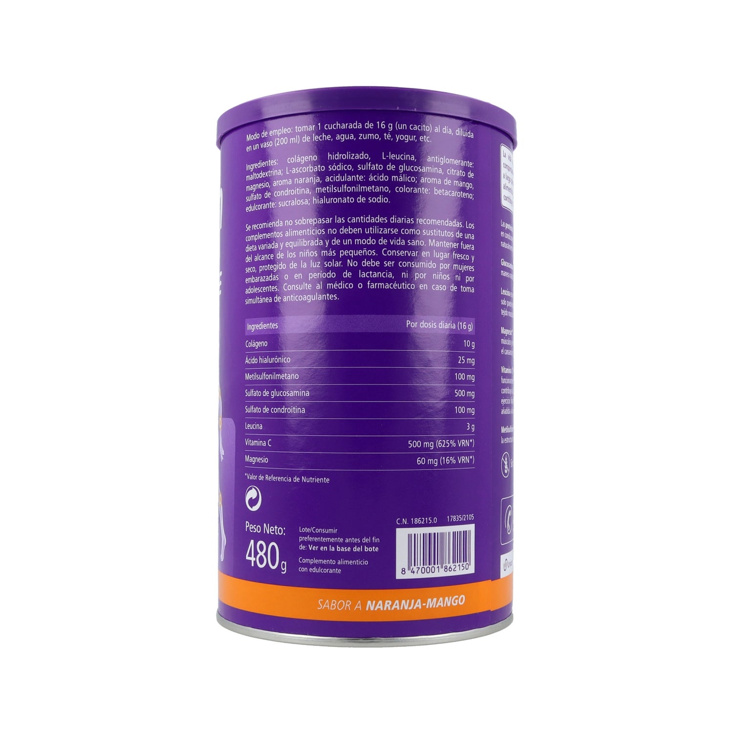 Collagène hydrolysé, L-Leucine, Citrate de Magnésium, Méthylsulfonylméthane, Sulfate de Glucosamine (dérivé de crustacés), Maltodextrine (Anti-agglomérant), L-Ascorbate de Sodium, Sulfate de chondroïtine, arôme d'orange, acide malique (acidifiant), arôme de mangue, bêta-carotène (colorant), sucralose (édulcorant), hyaluronate de sodium.