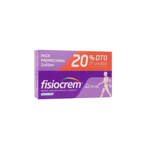 Fisiocrem Gel Active Effet Froid 2x60 ml pour la préparation musculaire et la récupération est un pack double avec deux tubes de 60 ml. Il est conçu pour les sportifs et les personnes actives, avec une formule naturelle qui apporte frais immédiat.