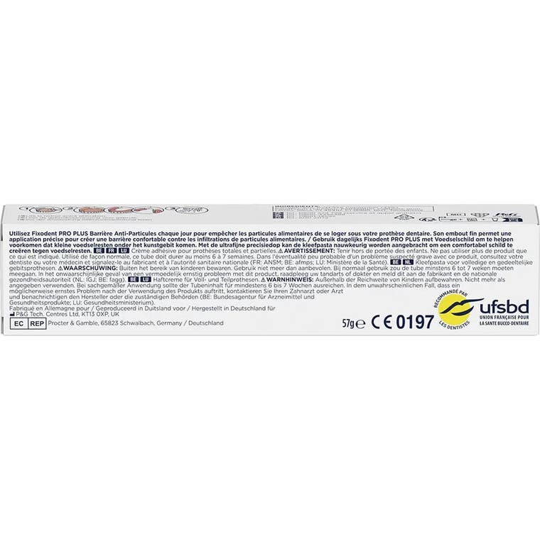 Fixodent Pro Plus Anti-Partículas 57 g est une crème adhésive spécialement conçue pour fournir un soutien optimal à ceux qui utilisent des prothèses dentaires, qu'elles soient partielles ou complètes. Grâce à sa technologie avancée, cette crème garantit une adhérence forte et durable tout au long de la journée, te permettant de réaliser tes activités en toute tranquillité, sans te soucier du glissement ou du décollage de la prothèse.