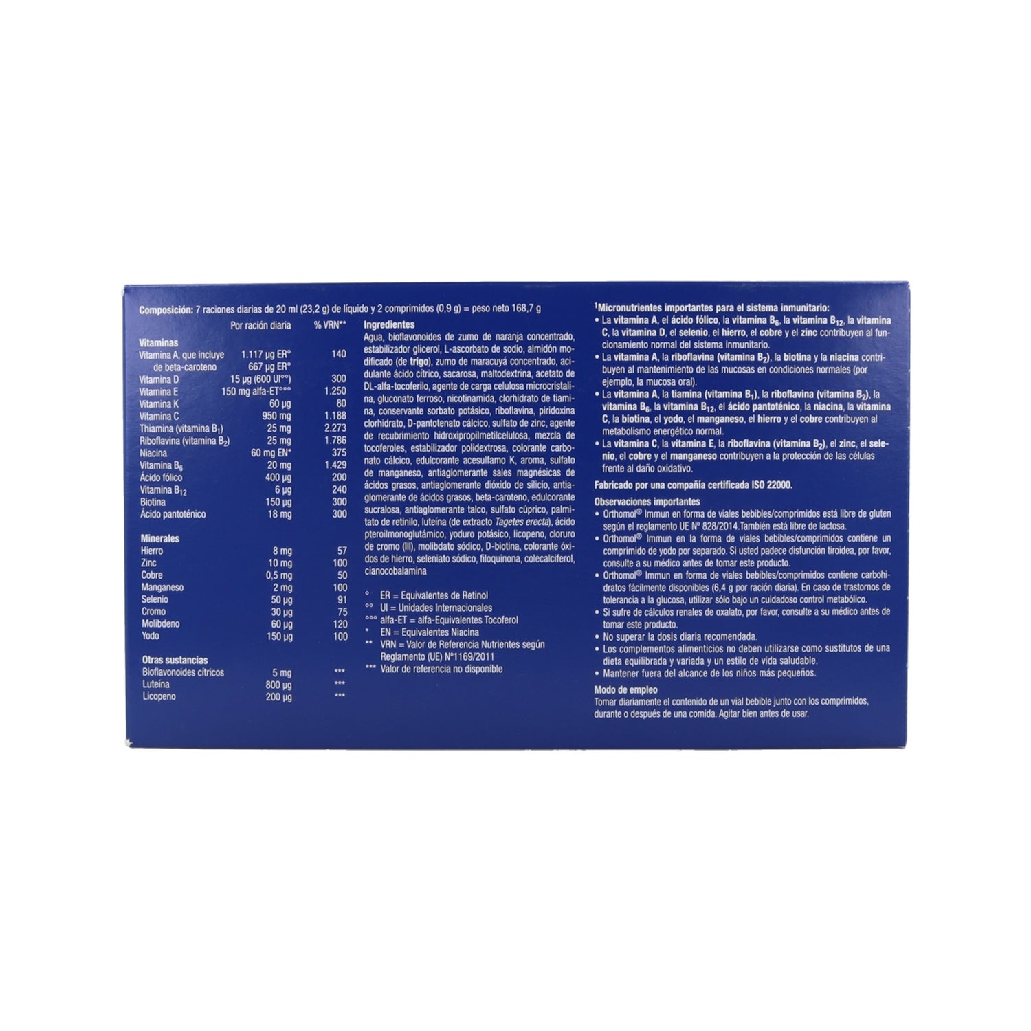 EAU, JUS D'ORANGE CONCENTRÉ AVEC BIOFLAVONOÏDES, GLYCÉROL (STABILISATEUR), L-ASCORBATE DE SODIUM, AMIDON MODIFIÉ (PROVENANT EN PARTIE DU BLÉ), JUS CONCENTRÉ DE FRUIT DE LA PASSION, SACCHAROSE, ACIDE L-LACTIQUE (ACIDIFIANT), MALTODEXTRINE, ACÉTATE DE DL-ALPHA TOCOPHÉRYLE, CELLULOSE MICROCRISTALLINE (ÉPAISSISSANT)SACCHAROSE, SACCHAROSE, ACIDE L-LACTIQUE (ACIDIFIANT), MALTODEXTRINE, ACÉTATE DE DL-ALPHA-TOCOPHÉRYLE, CELLULOSE MICROCRISTALLINE (ÉPAISSISSANT), GOMME ARABIQUE (STABILISANT), GLUCOSE, GLYCÉROL (STABILISANT), GLYCÉROL (STABILISANT), GLYCÉROL (STABILISANT)BIGA (STABILISATEUR), GLUCONATE FERREUX, NICOTINAMIDE, HUILES VÉGÉTALES (NOIX DE COCO ET TOURNESOL EN PROPORTIONS VARIABLES), CHLORHYDRATE DE THIAMINE, SORBATE DE POTASSIUM (CONSERVATEUR), RIBOFURANE (CONSERVATEUR).(CONSERVATEUR), RIBOFLAVINE, CHLORHYDRATE DE PYRIDOXINE, D-PANTOTHÉNATE DE CALCIUM, CHLORURE DE ZINC, TOCOPHÉROLS MIXTES, HYDROXYPROPYLMÉTHYLCELLULOSE (AGENT D'ENROBAGE), SELS DE MAGNÉSIUM D'ACIDES GRAS ALIMENTAIRES (AGENT D'ENROBAGE), SELS DE MAGNÉSIUM D'ACIDES GRAS ALIMENTAIRES (AGENT D'ENROBAGE).ACIDES GRAS (ANTI-AGGLOMÉRANT), ACÉSULFAME K (ÉDULCORANT), CYCLAMATE DE SODIUM (ÉDULCORANT), AMIDON DE MAÏS, SULFATE DE MANGANÈSE, SULFATE DE MANGANÈSE, CHLORURE DE SODIUM (ÉDULCORANT).SULFATE DE MANGANÈSE, SACCHARINE DE SODIUM (ÉDULCORANT), ARÔME, DIOXYDE DE SILICIUM (ANTI-AGGLOMÉRANT), BÊTA-CAROTÈNE, POLYDEXTROSE (STABILISATEUR), DIOXYDE DE TITANE (COLORANT), HYDROXYDE DE SODIUM (COLORANT), HYDROXYDE DE SODIUM (ÉDULCORANT).(STABILISATEUR), DIOXYDE DE TITANE (COLORANT), TALC (ANTI-AGGLOMÉRANT), SULFATE CUIVRIQUE, ACIDE PTÉROYLMONOGLUTAMIQUE, PALMITATE DE RÉTINYLE, AGENT LUTÉINISANT, SUCRALOSE (ÉDULCORANT), SUCRALOSE (ÉDULCORANT).NA, SUCRALOSE (ÉDULCORANT), LYCOPÈNE, IODURE DE POTASSIUM, D-BIOTINE, CHROME (III) CHLORURE, MOLYBDATE DE SODIUM, SÉLÉNATE DE SODIUM, PHYLLOQUINONE, CYANOCOBALAMINE, VITAMINE D3 (CHOLÉCALCIFÉROL).