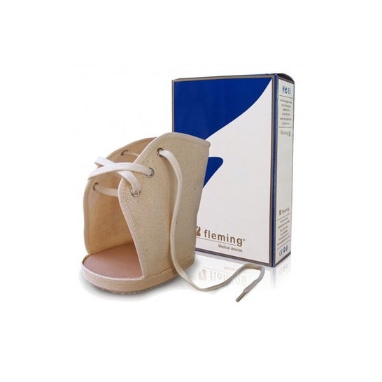 Chaussure post-opératoire fabriquée en cuir synthétique, toile et caoutchouc. Design type botte avec orteil ouvert et semelle antidérapante.