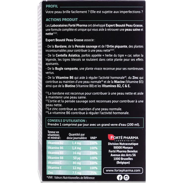 Forté Pharma Expert Beauté Peau Grasse est un complément alimentaire conçu pour aider à équilibrer et purifier les peaux sujettes aux imperfections. Ce produit combine des extraits de plantes connues pour leurs propriétés bénéfiques pour la peau, telles que :