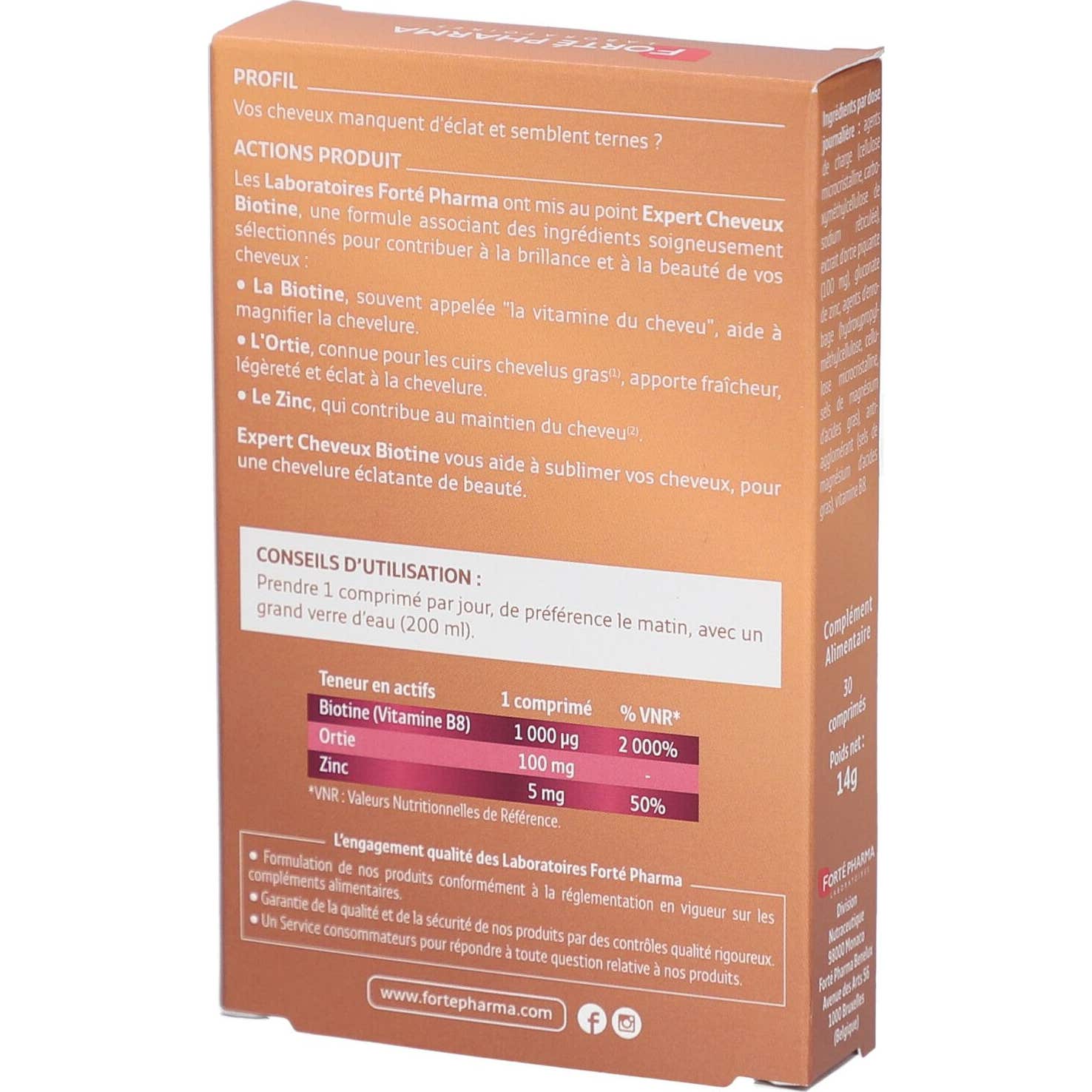 Forté Pharma Expert Cheveux Biotine est un complément conçu pour améliorer la santé et l'apparence des cheveux. Ce produit se présente sous forme de 30 comprimés, offrant une solution complète pour ceux qui cherchent à revitaliser leur chevelure, surtout s'ils sont confrontés à des problèmes tels que :