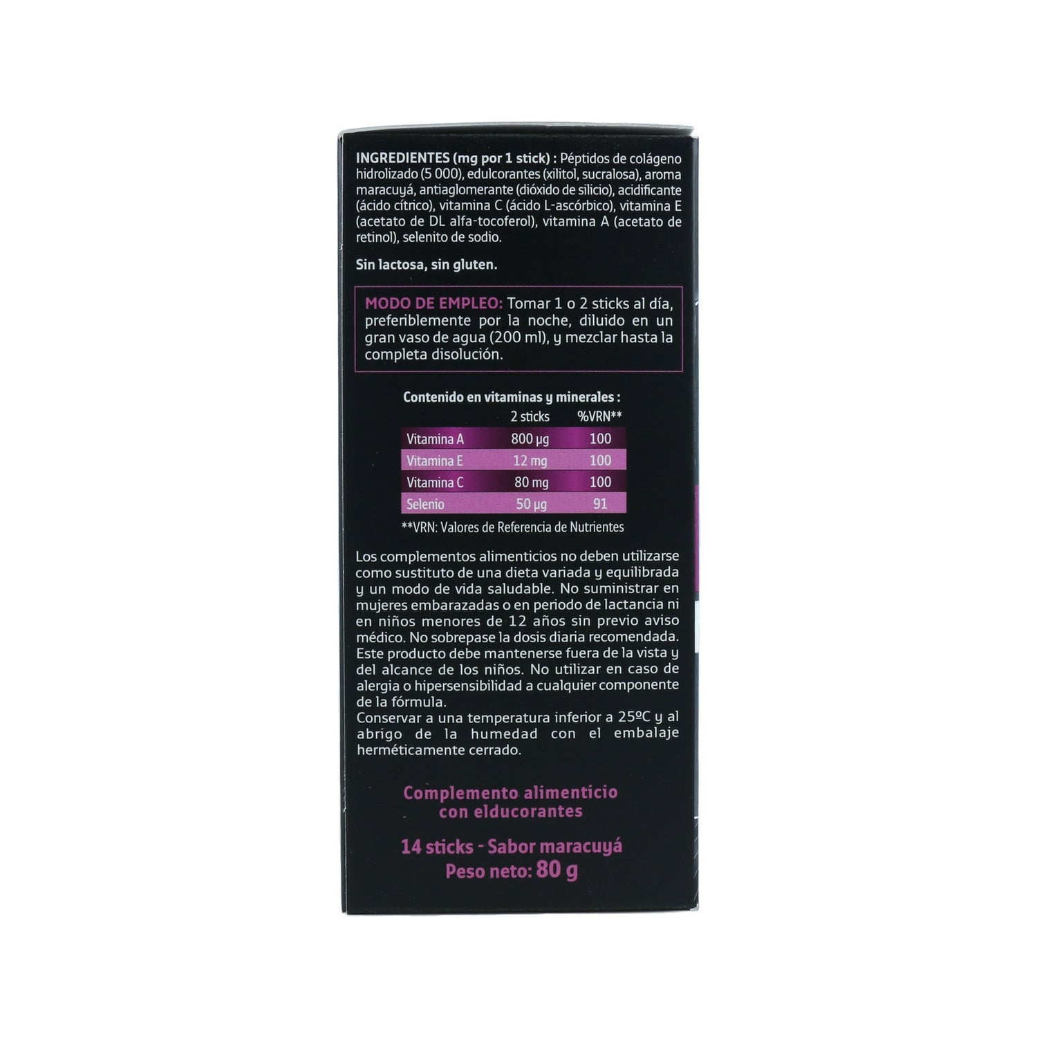 Collagène (5000 mg), vitamine A (100 mcg), vitamine C (40 mg), vitamine E (6 mg), sélénium (25 mcg).