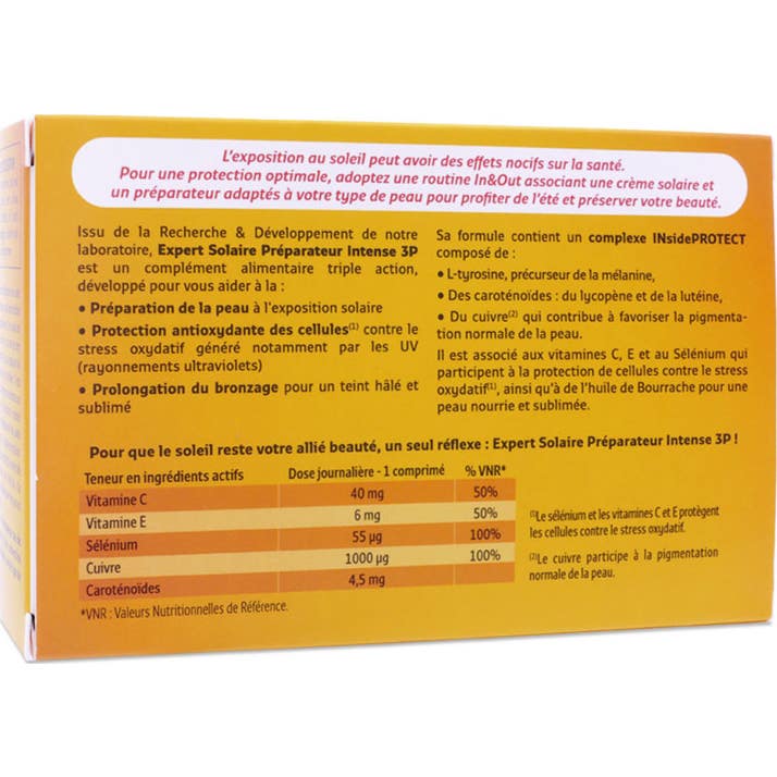 Développé par une équipe de scientifiques et de pharmaciens, Expert Solar Préparateur Intense 3P agit efficacement en combinant des ingrédients clés. Il contient :