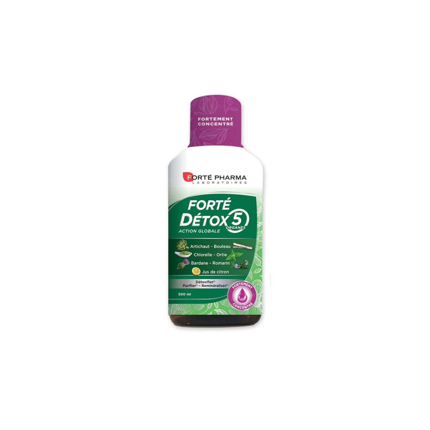 Forté Pharma Forté Detox 5 Organs 500 ml est un complément qui associe des ingrédients d'origine végétale (artichaut, citron, bouleau, chlorella, romarin et bardane) pour une action globale sur les 5 principaux organes impliqués dans les processus de purification de l'organisme.