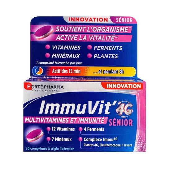 Agents de charge (hydroxypropyl méthylcellulose, cellulose microcristalline, hydroxypropylcellulose, carboxyméthylcellulose de sodium réticulée), vitamines (C, E, B3, A, B5, D3, B12, B6, B2, B1, B9, B8), oxyde de magnésium, extrait de gingembre (Zingiber Officinale Roscoe), Bêta-glucanes de levure (Saccharomyces Cerevisiae) titrés à 30%, acidifiant (phosphate de calcium), émulsifiant (mono et diglycérides d'acides gras), anti-agglomérants (sels de magnésium d'acides gras, dioxyde de silicium), concentré de carotte noire et d'hibiscus, fumarate de fer, extrait de ginseng (Panax Ginseng C.A. Meyer), oxyde de zinc, molybdate de sodium, gluconate de manganèse, lutéine, amidon de maïs, extrait d'éleuthérocoque (Eleutherococcus Senticosus Rupr. et Maxim.), colorant (oxyde de fer rouge), gelée royale lyophilisée, extrait de guarana (Paullinia Cupana Kunth), extrait de myrtille (Vaccinium Myrtillus L.), citrate de cuivre, Lactobacillus Casei LPC00, Lactobacillus Acidophilus LA02, Lactobacillus Rhamnosus GG, Bifidobacterium Lactis BS01, sélénite de sodium.