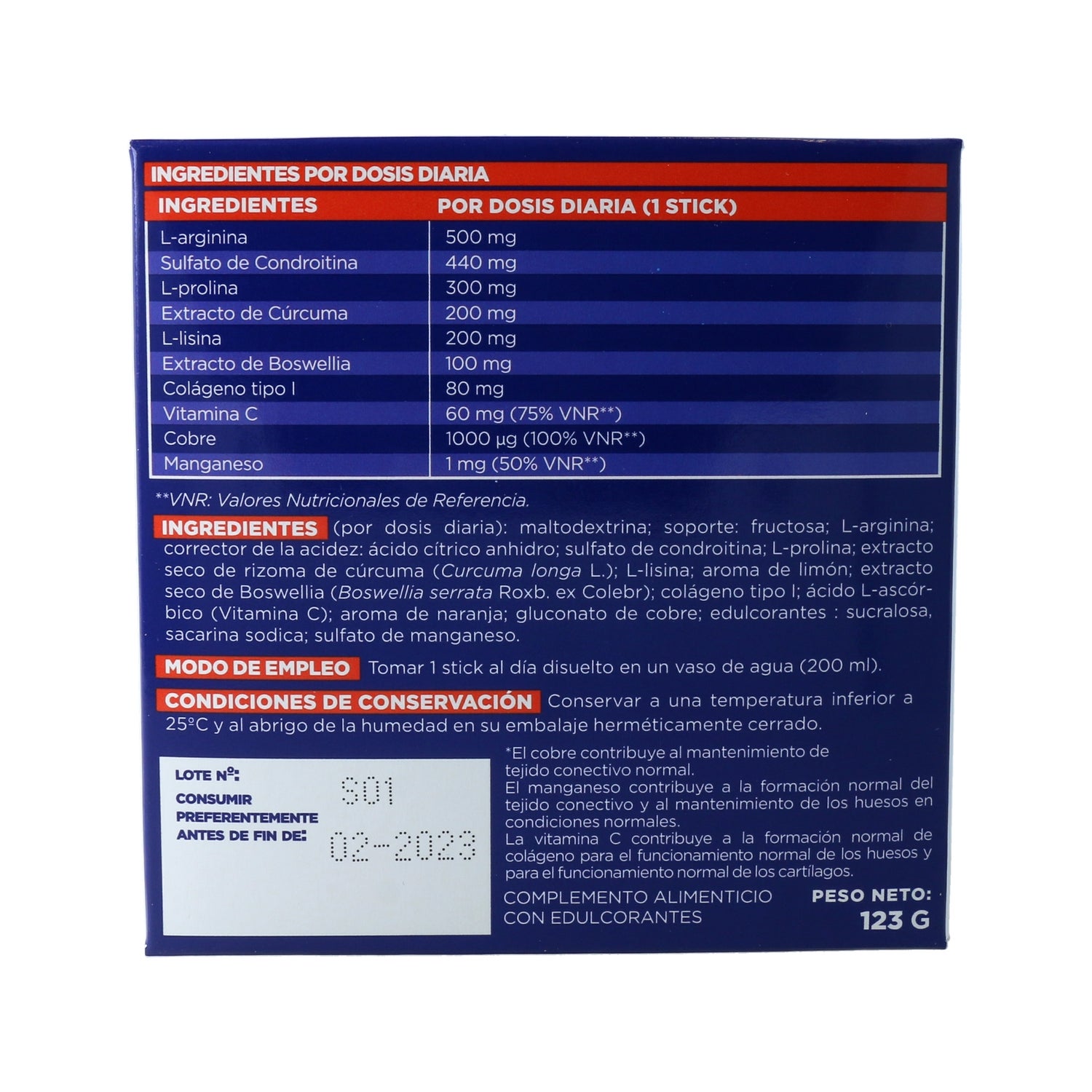 Sa formule associe du collagène hydrolysé de type I, du sulfate de chondroïtine, de la vitamine C, du manganèse, ainsi que des acides aminés, extraits de plantes, vitamines et minéraux aux propriétés anti-inflammatoires et antalgiques.