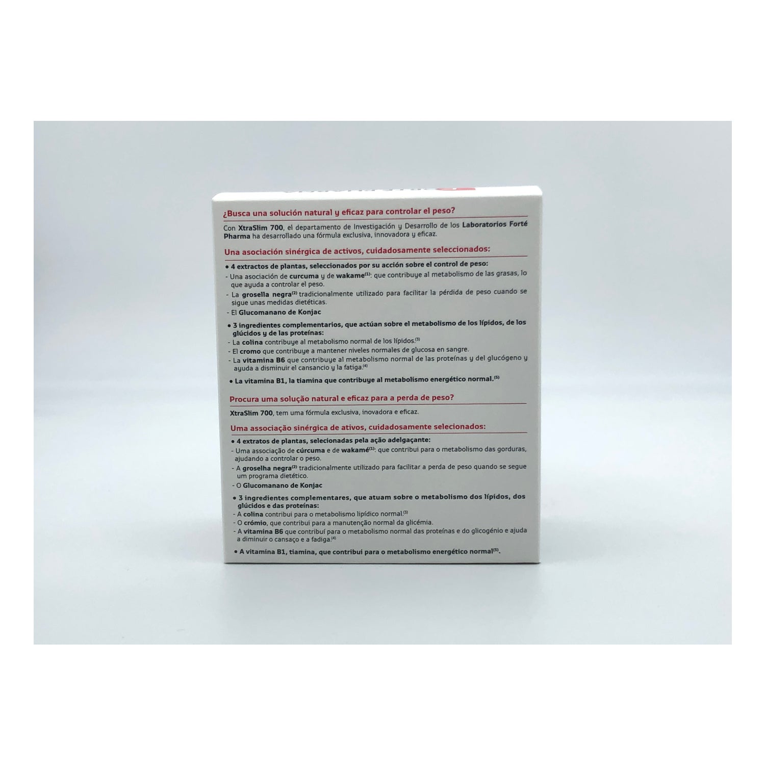 Sa formule est composée de 8 actifs dont 4 extraits de plantes. Le curcuma aide à brûler les graisses et à prévenir leur accumulation. Le wakamé contribue à réduire l'appétit, tout comme le konjac, plante originaire d’Asie du Sud-Est. En complément, le cassis facilite le drainage des toxines. Xtra Slim 700 des laboratoires Forté Pharma est également composé de 4 nutriments essentiels : la choline contribue à un métabolisme lipidique normal, le chrome est un oligo-élément essentiel dans le métabolisme des glucides et des lipides. La vitamine B6 contribue au métabolisme des acides aminés et du glycogène, et la vitamine B1, quant à elle, participe au bon équilibre du système nerveux et à un métabolisme énergétique normal.