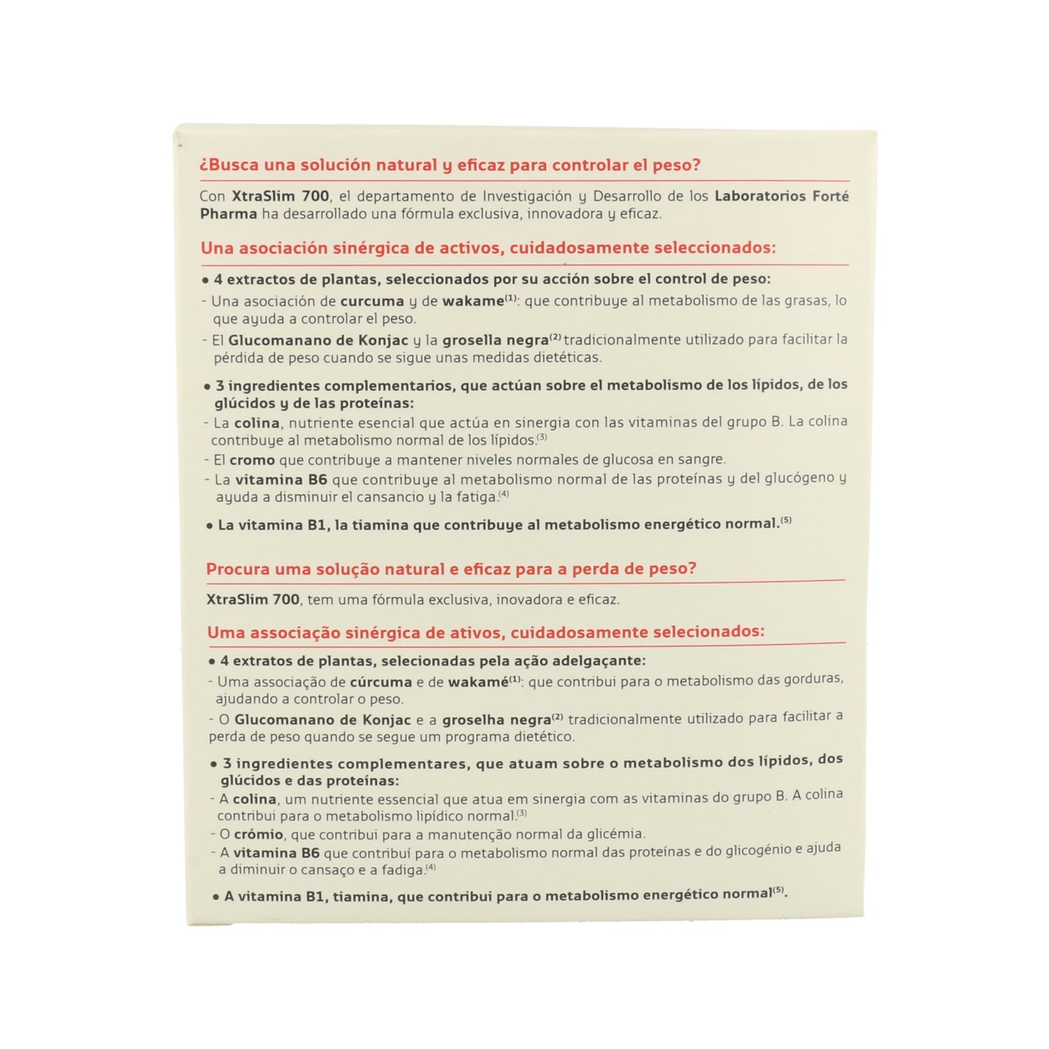 Sa formule est composée de 8 actifs dont 4 extraits de plantes. Le curcuma aide à brûler les graisses et à prévenir leur accumulation. Le wakamé contribue à réduire l'appétit, tout comme le konjac, plante originaire d’Asie du Sud-Est. En complément, le cassis facilite le drainage des toxines. Xtra Slim 700 des laboratoires Forté Pharma est également composé de 4 nutriments essentiels : la choline contribue à un métabolisme lipidique normal, le chrome est un oligo-élément essentiel dans le métabolisme des glucides et des lipides. La vitamine B6 contribue au métabolisme des acides aminés et du glycogène, et la vitamine B1, quant à elle, participe au bon équilibre du système nerveux et à un métabolisme énergétique normal.