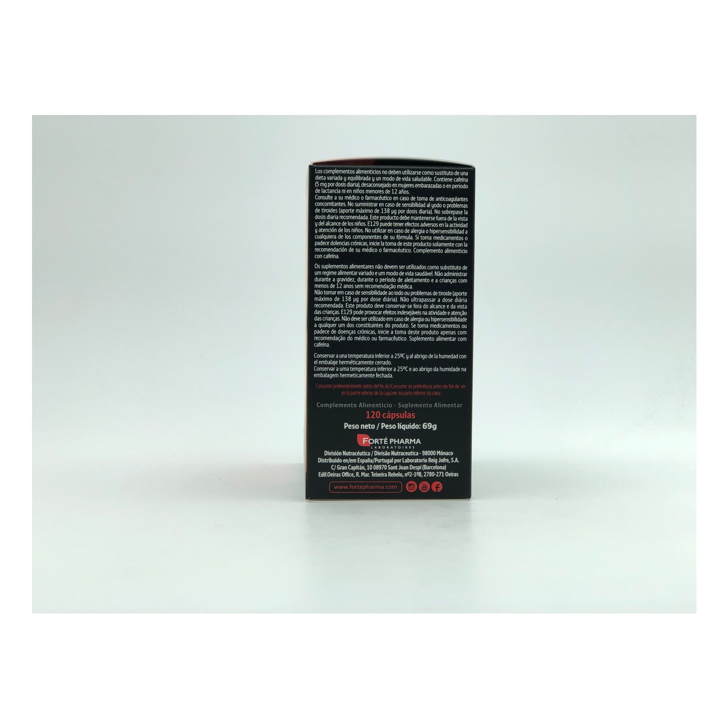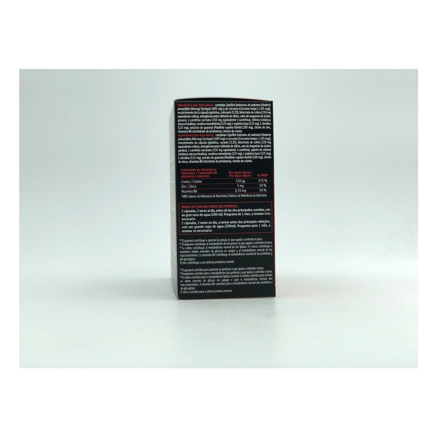 COMPLEXE LIPOXIM [EXTRAITS DE WAKAMÉ (UNDARIA PINNATIFIDA (HARVEY) SURINGAR) (405 M) ET DE CURCUMA (CURCUMA LONG L.) (45 MG)], ENVELOPPE DE LA GÉLULE (GÉLATINES, COLORANT ROUGE ALLURA AC), BITARTRATE DE CHOLINE (150 MG ÉQUIVALENT CHOLINE), ANTIAGGLOMÉRANTS (DIOXYDE DE SILICIUM, SELS DE MAGNÉSIUM D’ACIDES GRAS), L-CARNITINE TARTRATE (150 MG ÉQUIVALENT L-CARNITINE), AGENT DE CHARGE (CELLULOSE MICROCRISTALLINE), CRÉATINE MONOHYDRATÉ (125 MG), EXTRAIT DE GUARANA (PAULLINIA CUPANA KUNTH) (100 MG), CITRATE DE ZINC, VITAMINE B6 (CHLORHYDRATE DE PYRIDOXINE), CHLORURE DE CHROME. SANS DIOXYDE DE TITANE.