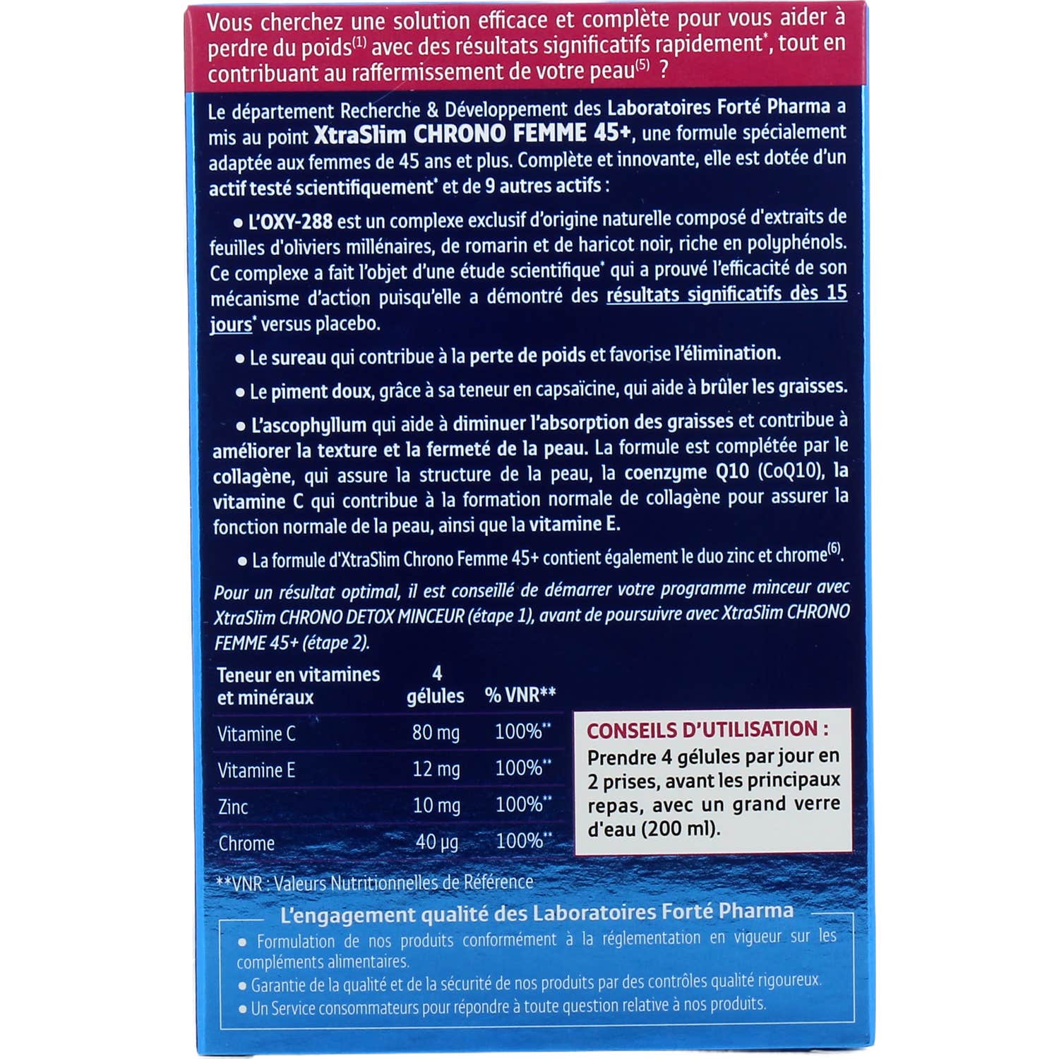 Forté Pharma Xtraslim Chrono Perte de Poids Femme 45+ 60caps est un complément alimentaire conçu pour aider les femmes de plus de 45 ans à perdre du poids tout en améliorant la fermeté de la peau.