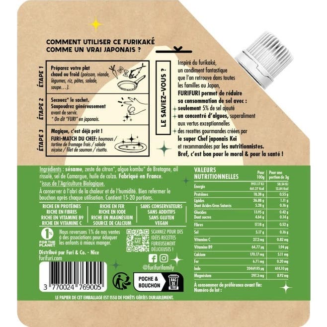 Furi Furi Furikake Citron 45 gr est un assaisonnement 100% naturel, fabriqué en France. Ce produit combine une variété d'ingrédients de haute qualité, y compris :