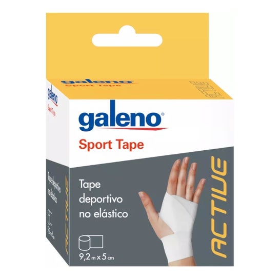 Galeno Sport Tape 9,2Mx5cm est un ruban de sport de couleur blanche, avec des dimensions de 9,2 mètres de longueur et 5 centimètres de largeur, conçu pour le bandage et le soutien pendant la pratique d'activités sportives.