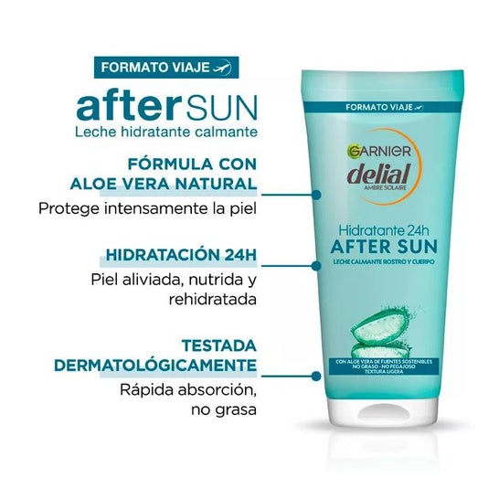 Garnier Delial Aftersun Lait Hydratant Apaisant 100ml est un après-soleil enrichi en aloe vera, conçu pour rafraîchir et hydrater la peau après une exposition au soleil.
