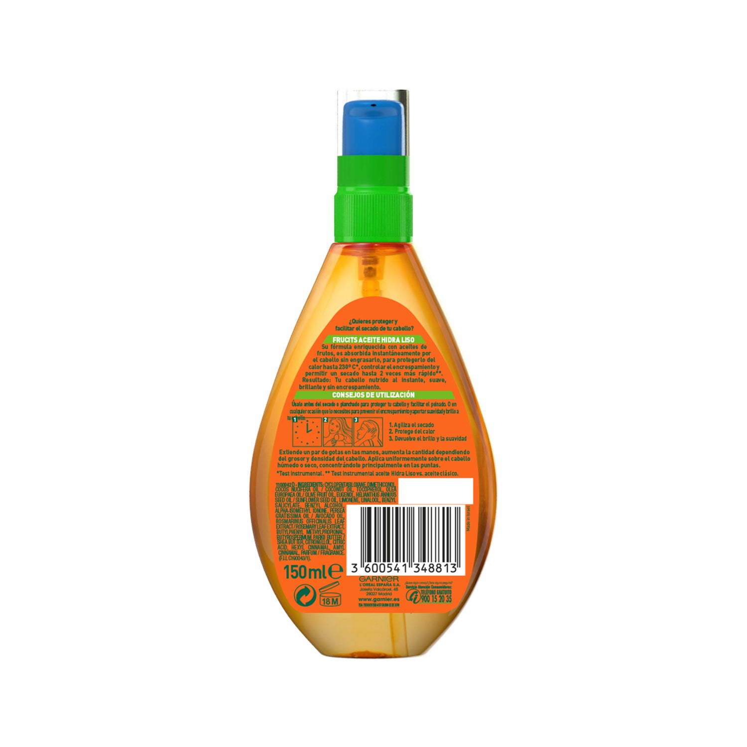 Sa formule combine huiles nutritives, y compris huile d'argan, et agit comme un protecteur thermique jusqu'à 230°C. Elle facilite le coiffage et réduit les frisottis dès la première application.