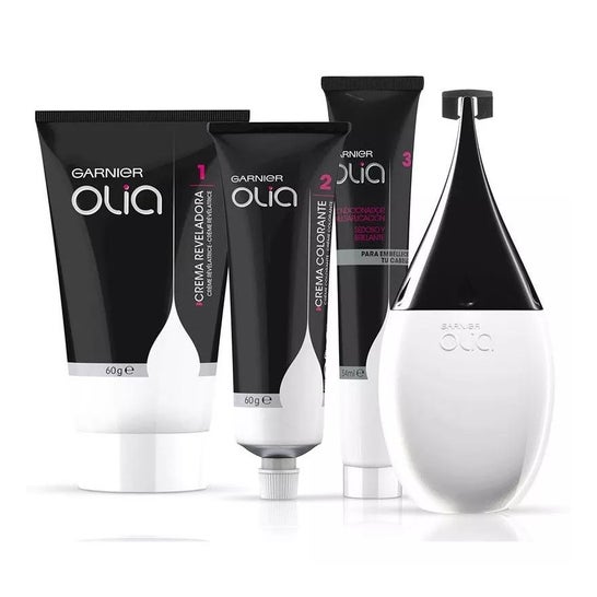 Le kit comprend une crème colorante, une crème révélatrice et un conditionneur, ainsi qu'un applicateur ergonomique pour plus de précision. La gamme de coloration Olia offre un large choix allant jusqu'à 30 nuances.