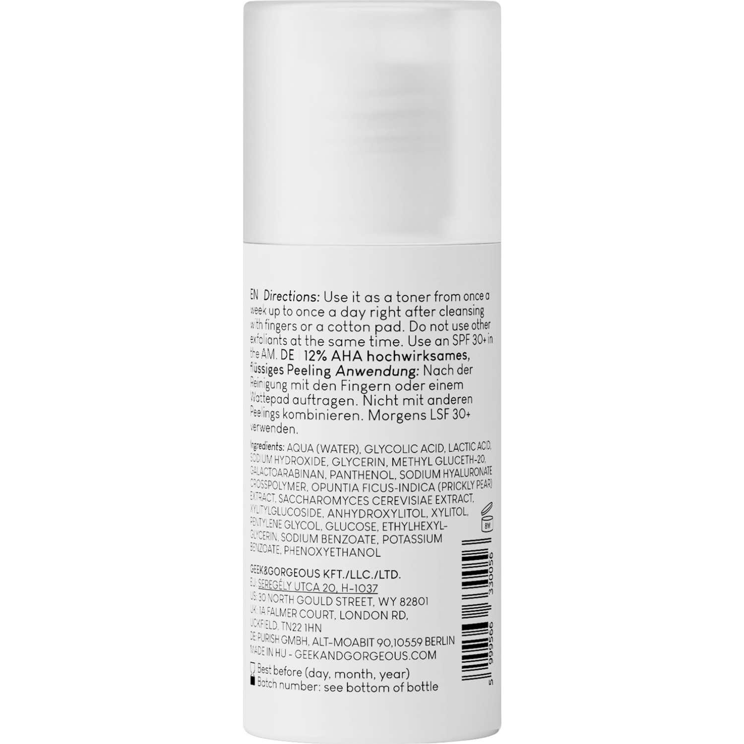 Geek & Gorgeous Smooth Out 12% AHA + Cactus Liquid est un exfoliant facial concentré qui combine un 12% d'AHA avec de l'extrait de cactus nopal. Ce produit est conçu pour offrir un traitement anti-âge, favorisant une peau plus fraîche, saine et attrayante.