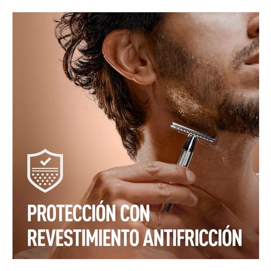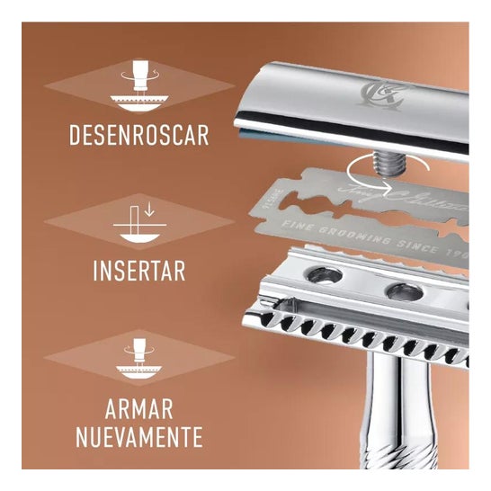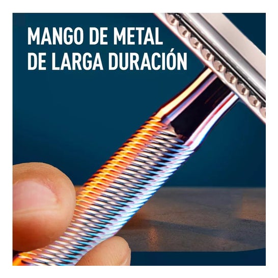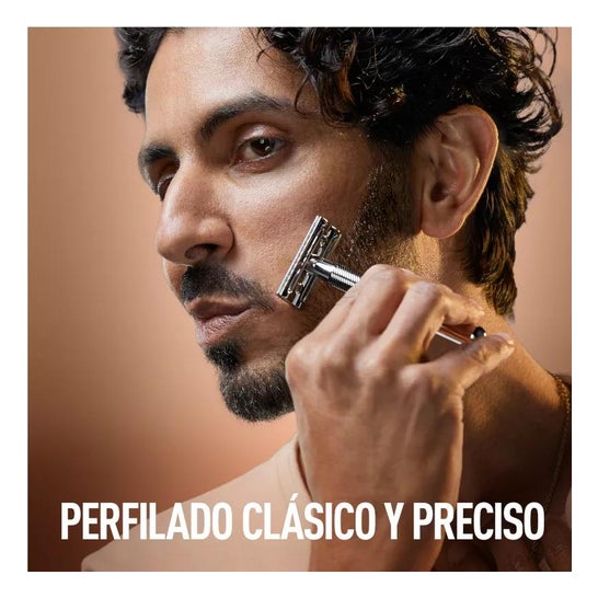 Rasoir de sécurité avec lame à double tranchant. Permet d'obtenir un rasage précis avec une finition professionnelle. Idéal pour une utilisation sur les contours du visage, du cou et des oreilles, car il évite la possibilité de grandes coupures de la peau. Idéal pour le rasage de tout type de poils.