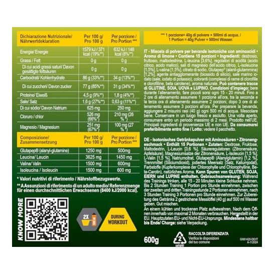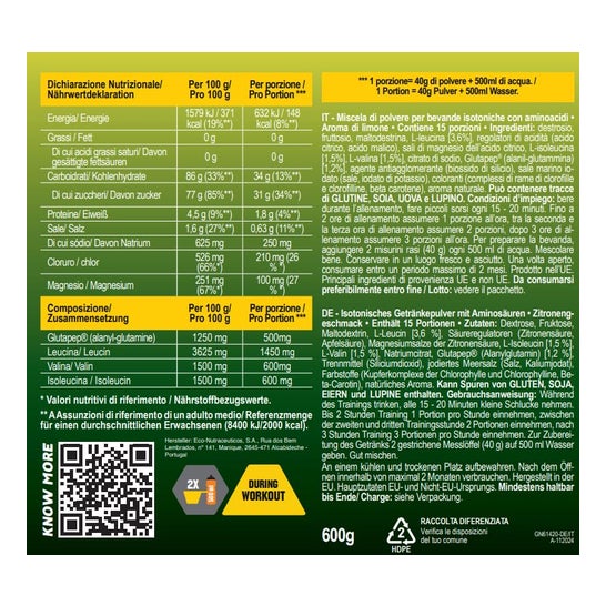 Gold Nutrition Goldrink Premium Lemon 600g est une boisson isotonique sous forme de poudre soluble contenant des électrolytes, BCCA et Glutapep®.