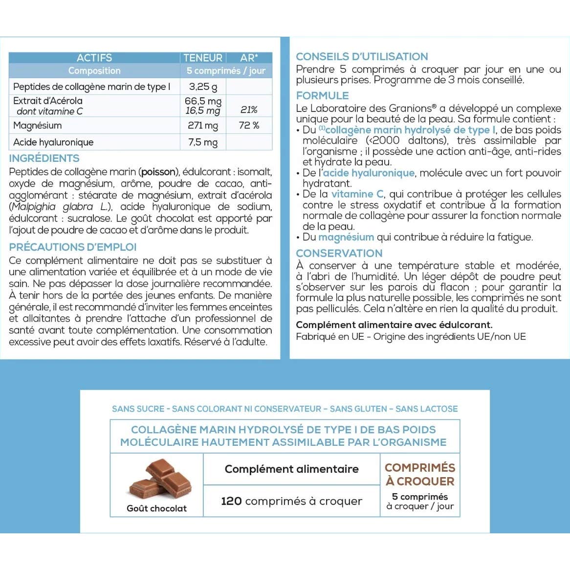 Granions Collagène + Beauté Goût Chocolat 120 Comprimés est un complément beauté version gourmande qui associe :