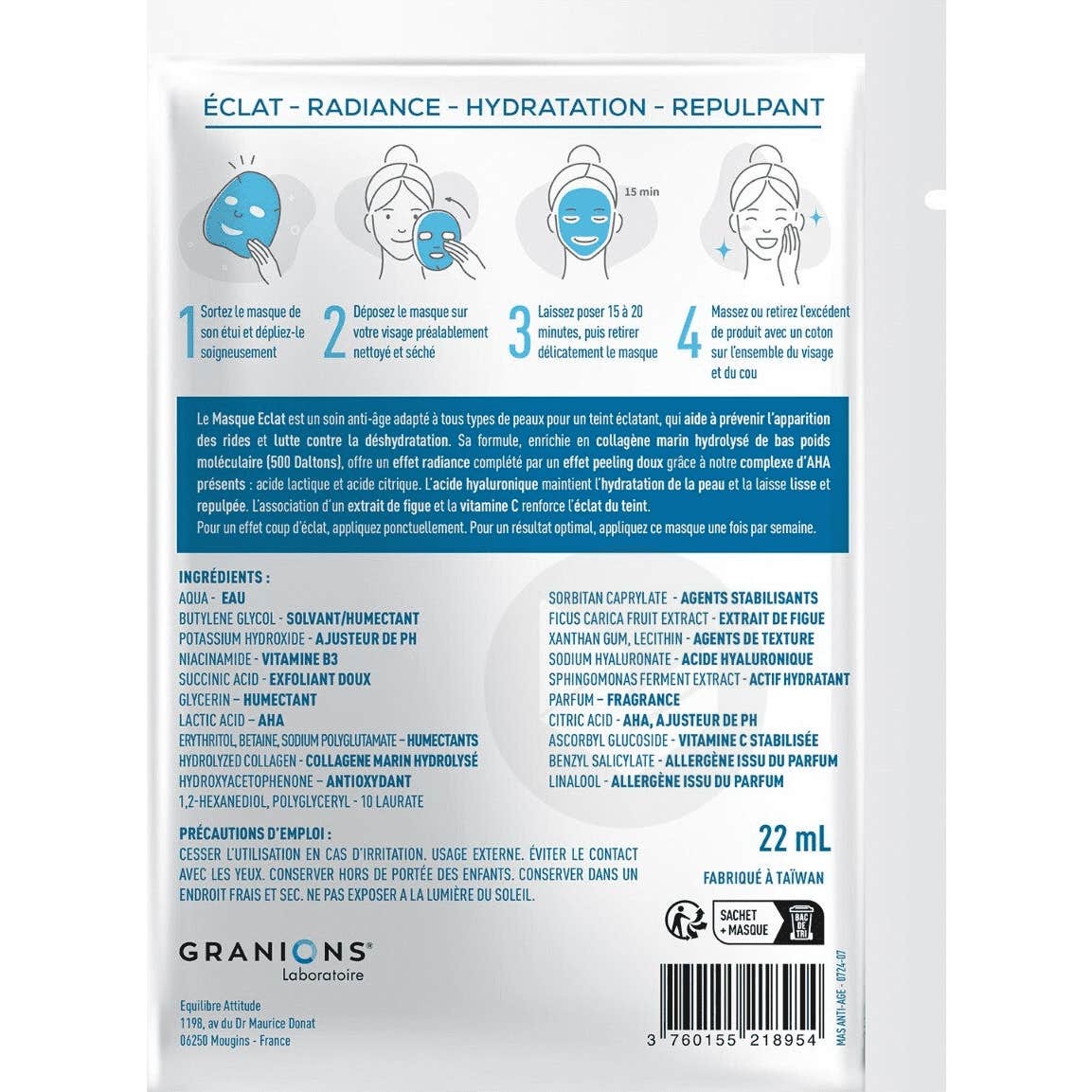 Granions Dermatologie Masque Seconde Peau Anti-Âge de 22 ml est un traitement sous forme de masque qui procure un effet de seconde peau. Il est conçu pour offrir une explosion immédiate de luminosité et une hydratation intense, adapté à tous les types de peau.