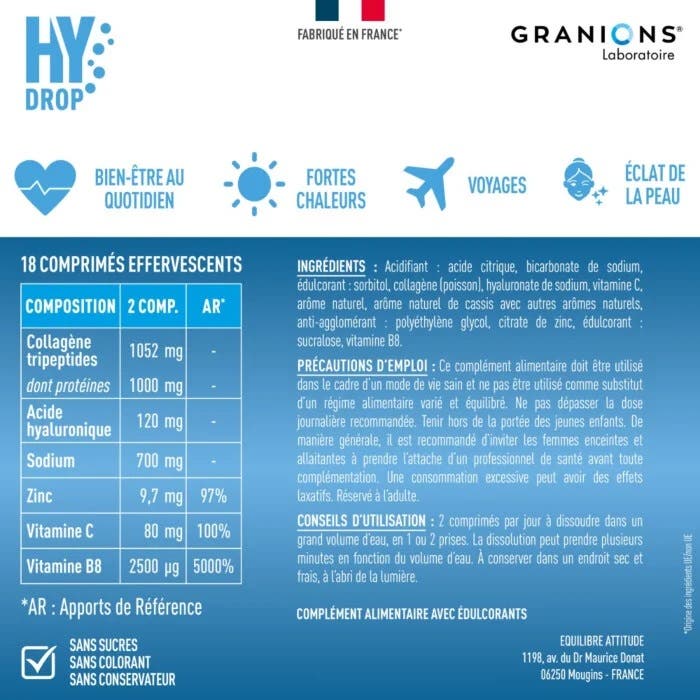 Granions Hydrop Collagen se présente dans une formule sans sucres, colorants et conservateurs. Son goût naturel de framboise et de cassis en fait une option agréable à inclure dans la routine quotidienne, idéale après l'exercice ou au quotidien.