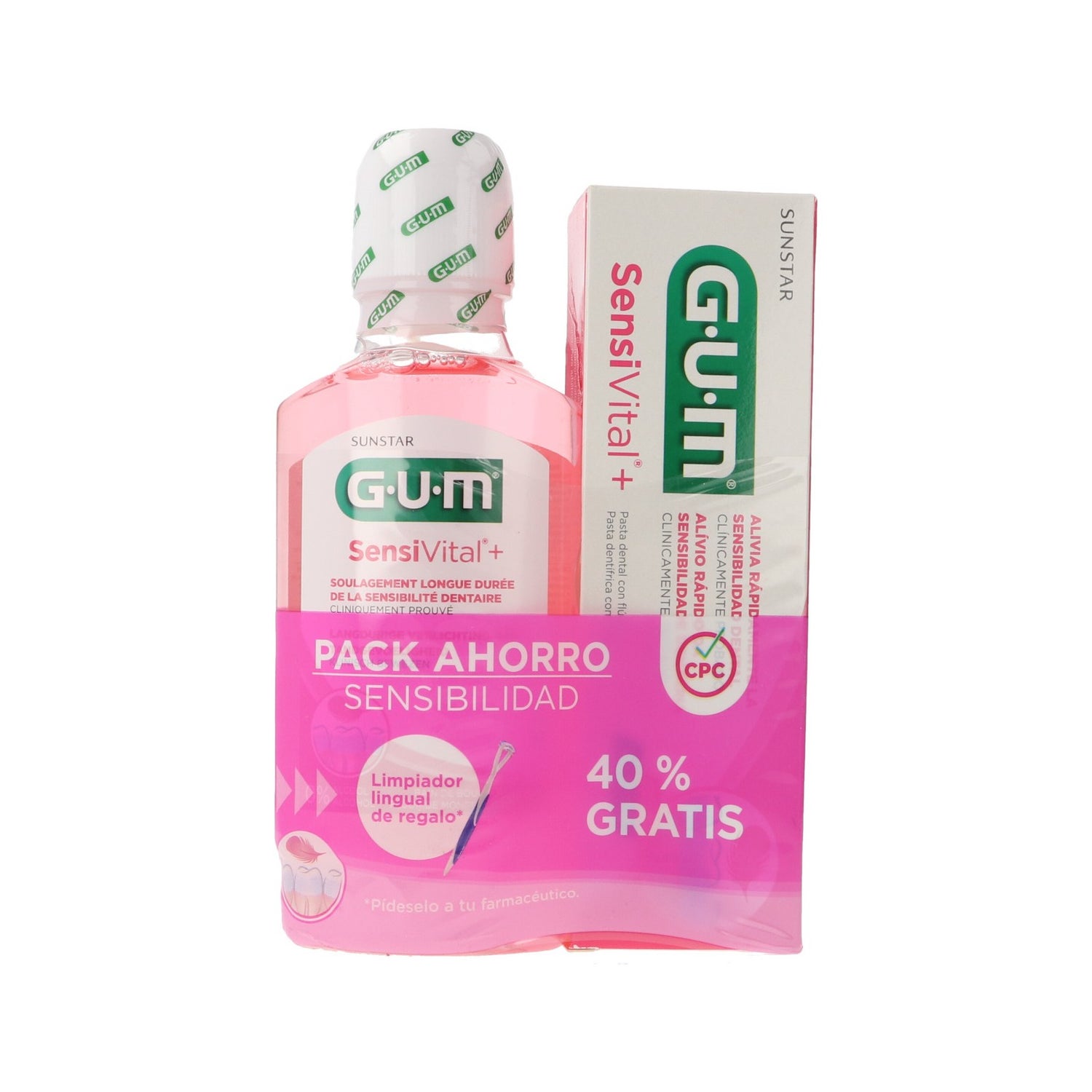 Gum Pack Sensivital+ Mouthwash + Toothpaste set de bain de bouche et de dentifrice, indiqué pour les cas de sensibilité dentaire, exprimée par une douleur lors de la consommation d'aliments ou de boissons froids, chauds, acides ou sucrés, de la respiration d'air froid ou du brossage des dents.