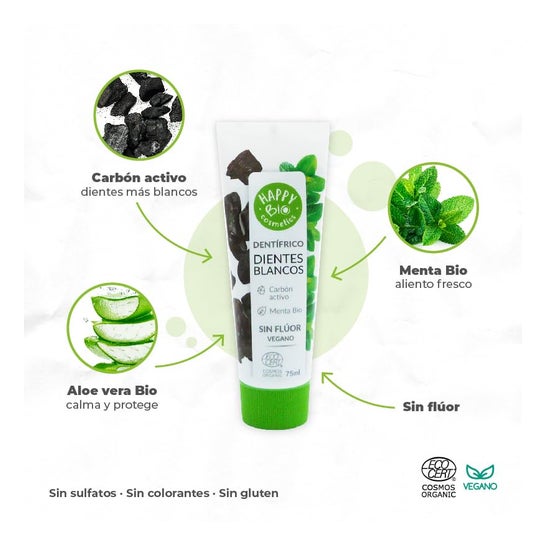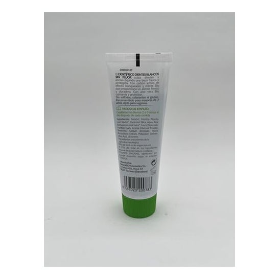 Dentifrice qui aide à maintenir une hygiène buccale optimale, sans bactéries ni mauvaise haleine, avec effet blanchissant grâce à sa formule au charbon actif et aux ingrédients issus de l'agriculture biologique. Il a un goût de menthe et d'eucalyptus qui laisse une haleine fraîche et ne contient pas de fluorure, il protège donc l'émail.