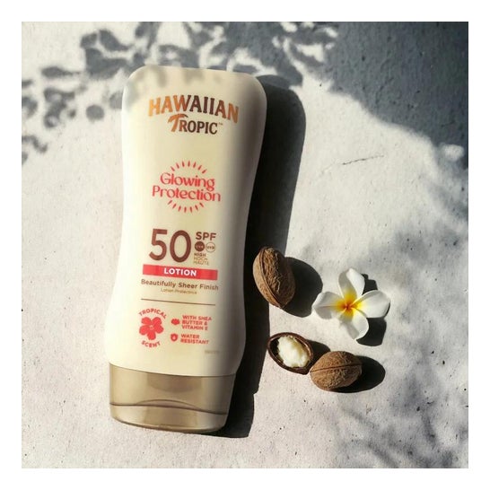 Hawaiian Tropic Lotion Glowing Protection SPF50 180ml est une crème corporelle hydratante qui offre de multiples avantages :