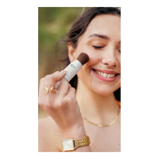 Son format poudre avec pinceau lui permet d'être appliqué directement sur la peau ou sur le maquillage. Sa formule légère offre un fini mat et le parfum tropical caractéristique de la marque.