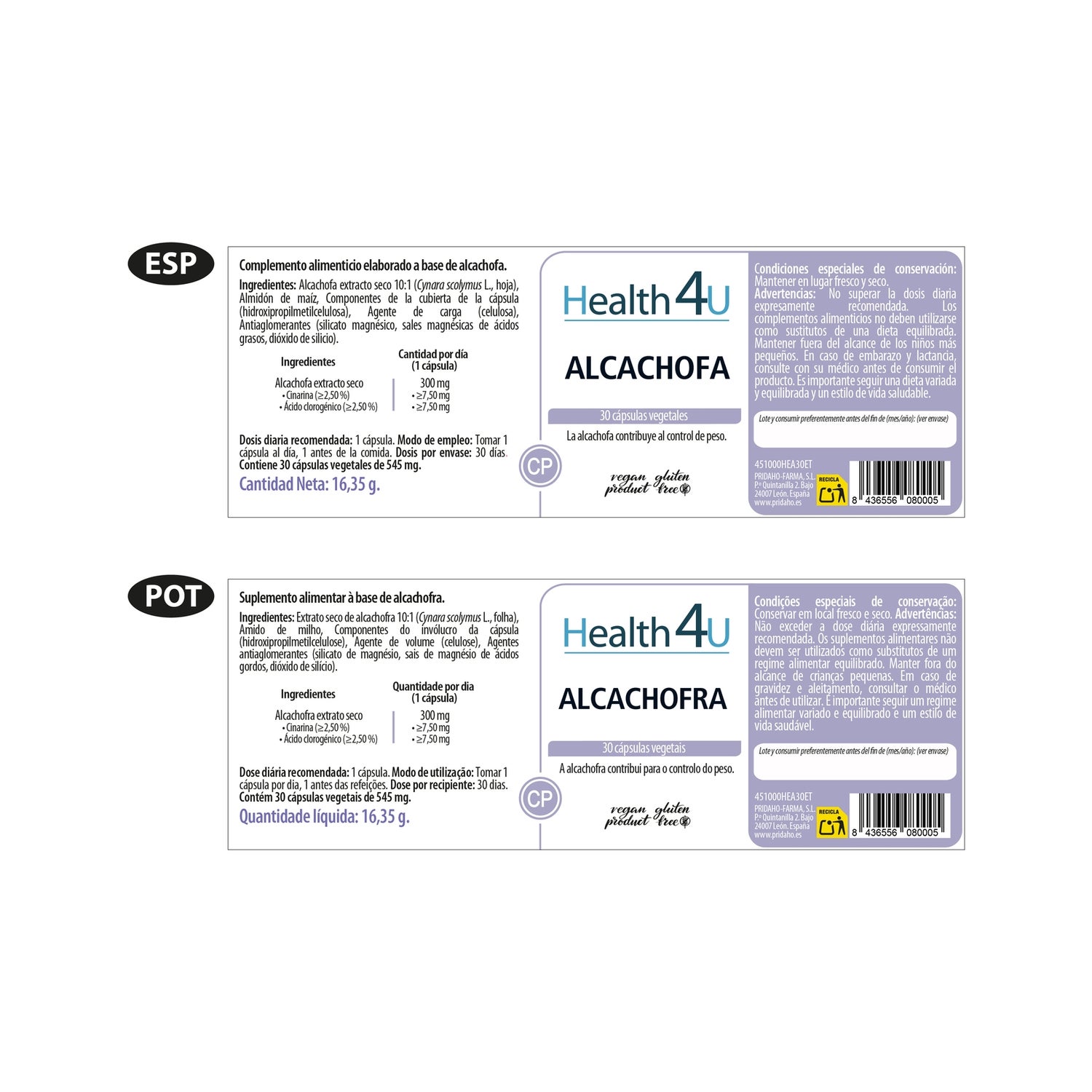 Health 4U Alcachofera 400mg 100compest uncomplément alimentaireriche en extrait d'artichaut qui vous aidera àréguler le taux de cholestérol.