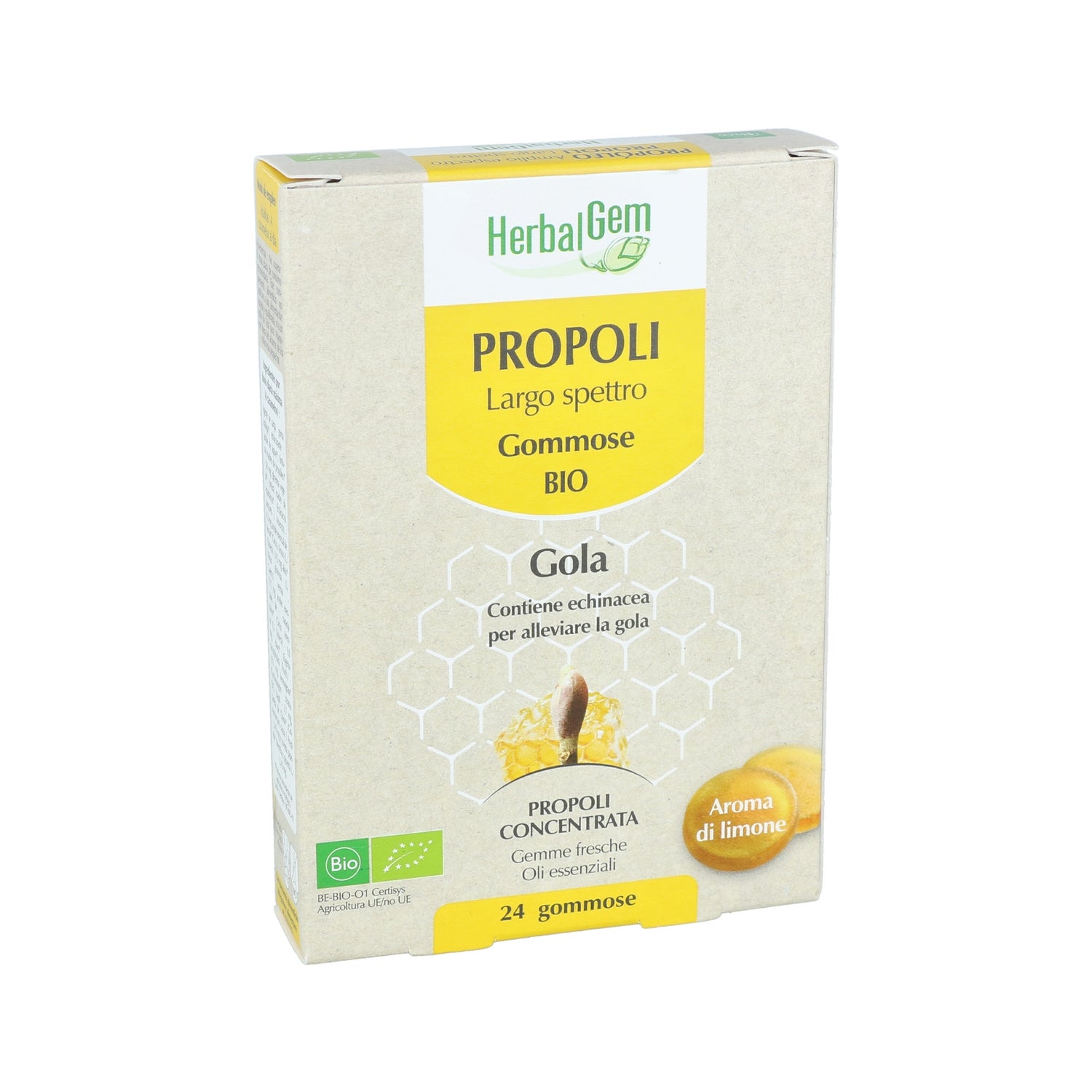 Herbalgem Propolis Broad Spectrum 24 Candy est un bonbon au citron à base de propolis, d'échinacée et d'huiles essentielles naturelles. Ils aident à apaiser et à calmer un mal de gorge et contribuent à améliorer les défenses de l'organisme, ainsi qu'à le protéger contre les infections provenant du système respiratoire.