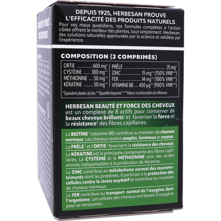 Herbesan Beauté et Force des Cheveux est un complément alimentaire qui combine huit ingrédients actifs conçus pour maintenir tes cheveux brillants et favoriser leur résistance et leur force. Ce produit est destiné aux adultes et convient à tous les types de cheveux.