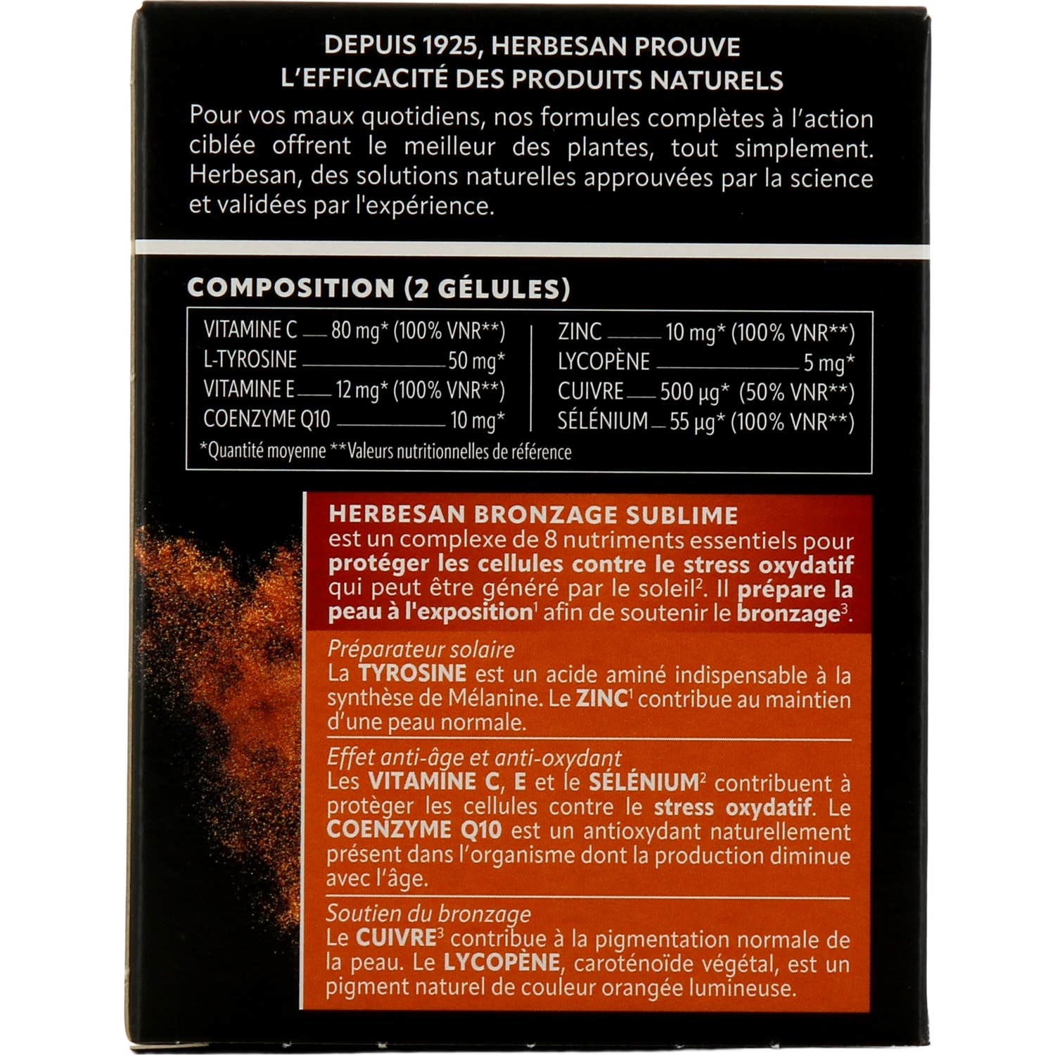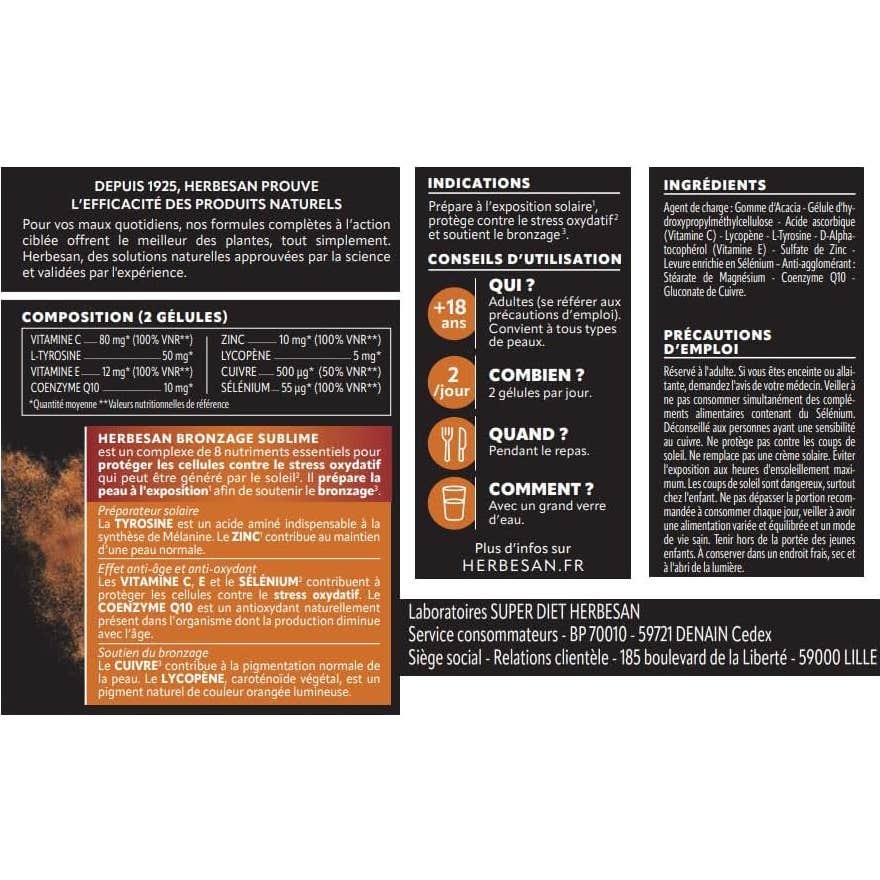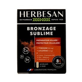Herbesan Bronzage Sublime 60 Perles est un complément alimentaire qui contient un complexe de huit nutriments essentiels. Il est conçu pour protéger les cellules du corps contre le stress oxydatif pouvant être provoqué par l'exposition au soleil. Ce produit se concentre sur préparer la peau pour le bronzage, favorisant un teint plus uniforme et radieux.
