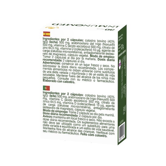 Complément alimentaire à base de colostrum bovin et de zinc. Contribue à renforcer le système immunitaire et à améliorer le fonctionnement de la flore intestinale. Enrichi en vitamines C et D, qui contribuent à réduire la sensation de fatigue et à augmenter l'absorption du calcium dans les os. Il favorise également l'élimination des agents pathogènes de l'organisme et les performances musculaires et intellectuelles.