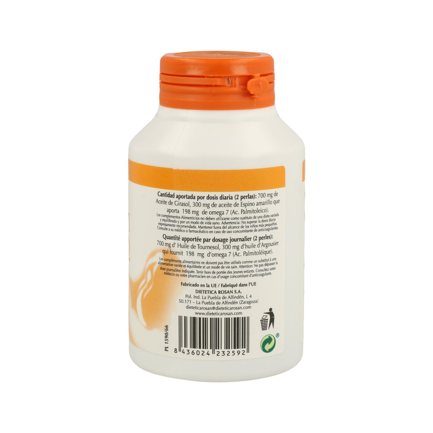 Complément alimentaire sous forme de gélules spécialement conçu pour agir comme antioxydant des cellules de l'organisme, en favorisant la régénération cellulaire et en renforçant le système immunitaire grâce à son composé, élaboré à partir d'huile d'argousier de première pression à froid et d'oméga 7.