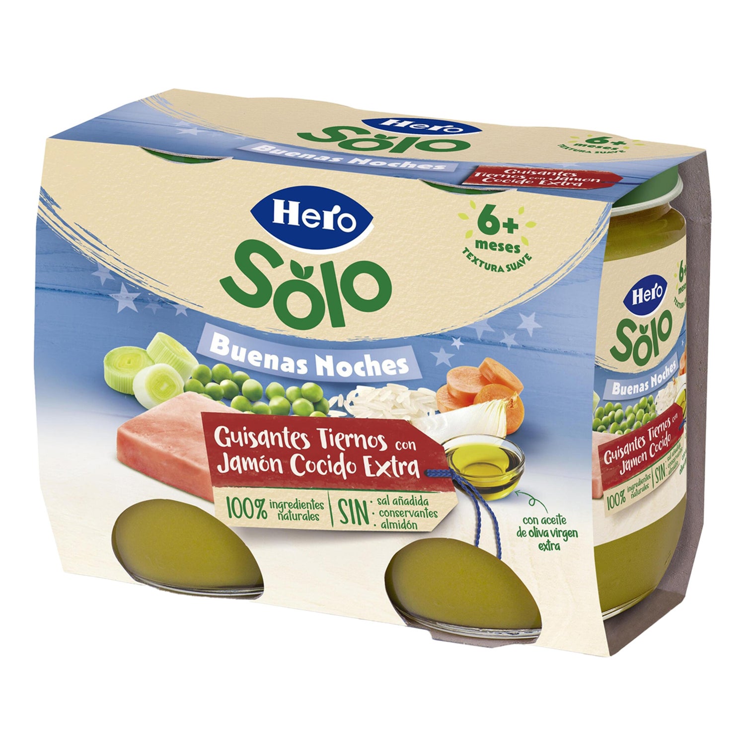 Hero Baby Bonnes Nuits Petits Pois Jambon est un produit conçu pour les bébés à partir de six mois. Ce pack comprend des petits pois tendres avec du jambon cuit, élaboré selon les hauts standards de qualité de Hero. Il ne contient pas de gluten, ni de sucre ajouté, ni d'amidon, ce qui en fait une option adaptée pour les plus petits.